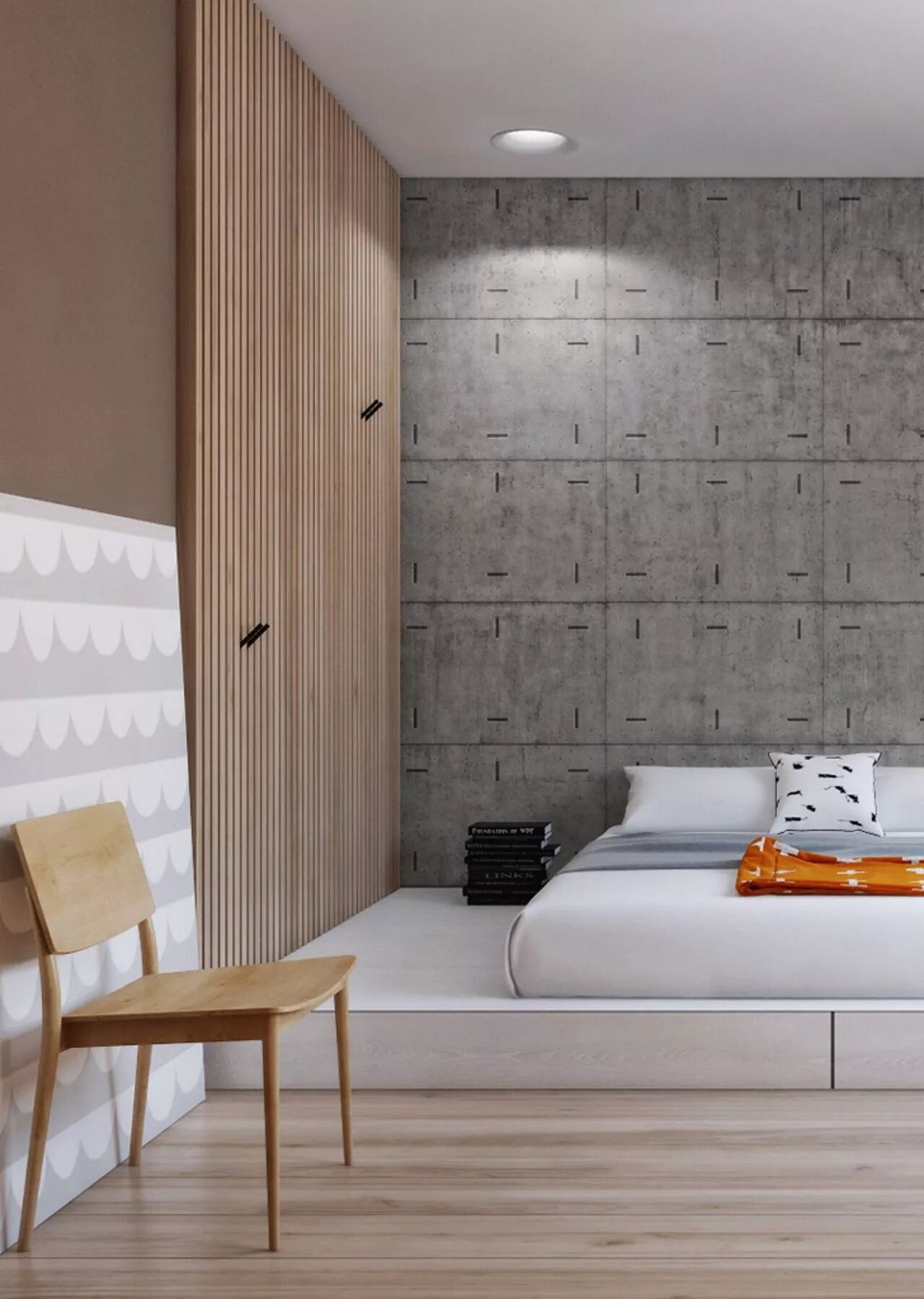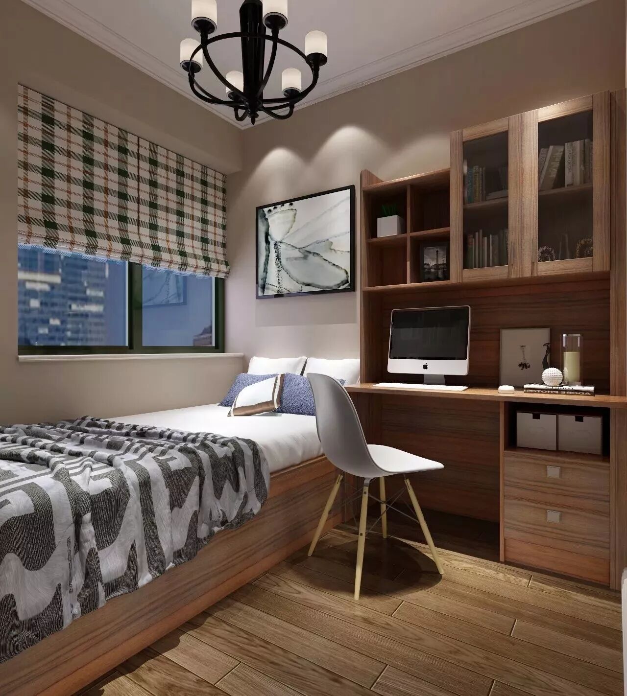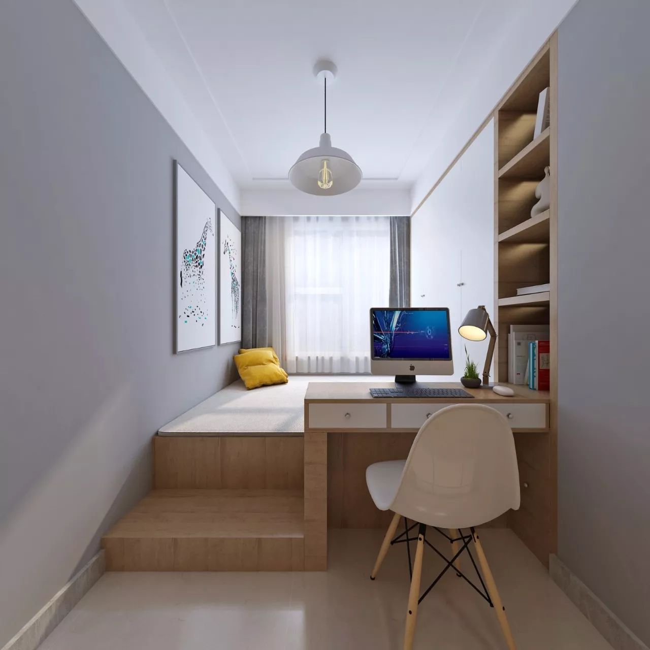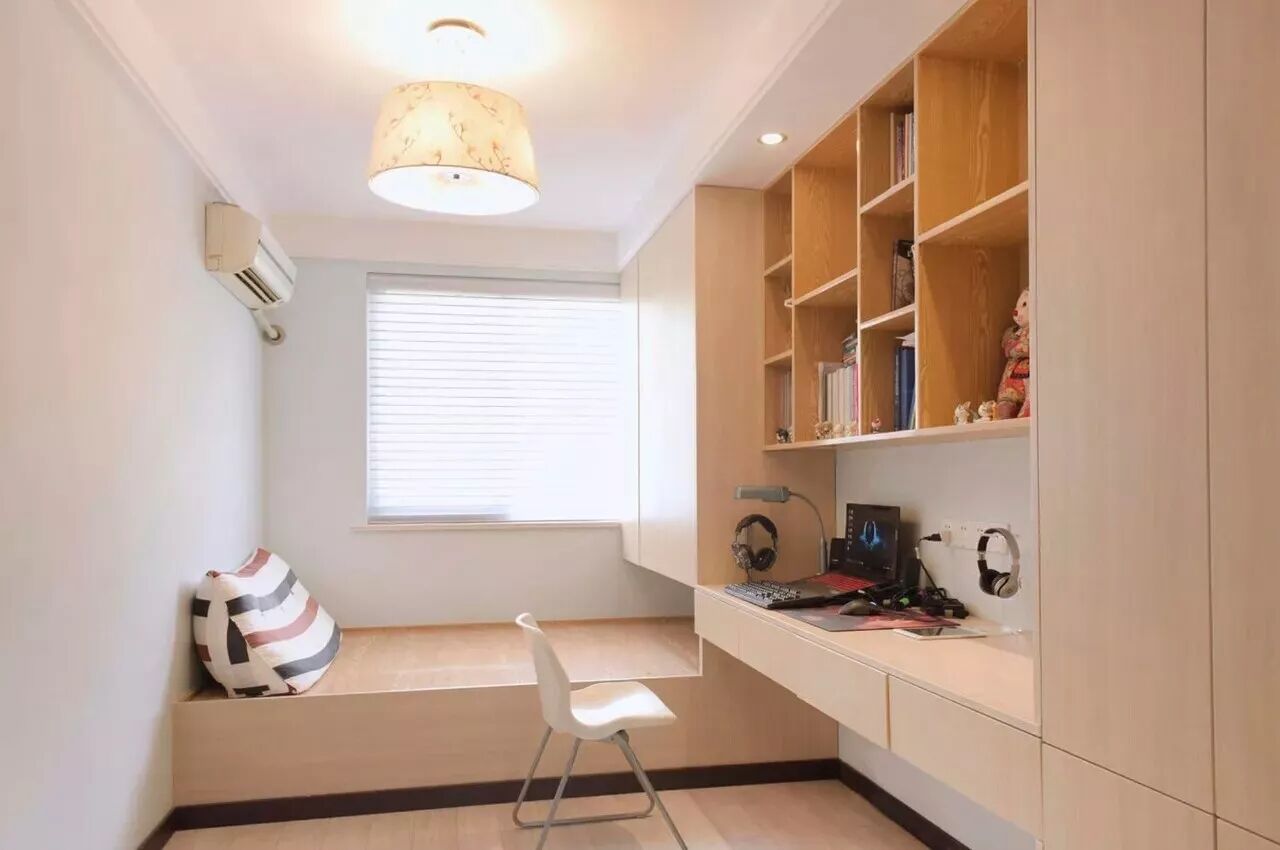 榻榻米作为基本的休闲空间,抬高其整体的底部,用一张长搁板当临时书桌,整个空间层次感十足,就算是小空间,也有了嬉戏打闹的娱乐场地。